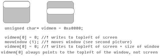 Because different modes uses different address mappings, it is possible to combine a monochome display adapter and color adapter on the same machine. This allows a computer with a dual monitor setup to be able to run without issues. Of course, this is just standard VGA. Super VGASuper VGA and other display adapters typically do things differently. It is not uncommon to see a Super VGA or higher resolution display adapter to have VRAM mapped to a high address range. While they will usually support the Standard VGA memory mapped range, they can use other memory ranges as well to help with high resolution video modes or to provide additional functionality. For example, my NVideo GeForce 7600 GT has 4 memory ranges that it can use: 0xA0000 - 0x000BFFFFF (Look familier?), 0xFC000000 - 0xFCFFFFFF, 0xD0000000 - 0xDFFFFFFF, and 0xFD000000 - 0xFDFFFFFF. This can be different on your system. Linear Frame Buffer (LFB)If it is possible to map the entire video memory of the current display into the physical address space, it is possible to set it up to act like a linear frame buffer. A linear frame buffer is just a packed-pixel frame buffer that allows you to be able to read or write to it in linear fashion. For example, buffer[0] is the first element of the buffer, buffer[1] is the second - there is nothing special. Well, actually there is. Standard VGA does not support LFB modes. Remember Mode 0x13 above? That is the only Standard VGA video mode that creates the effect of a linear frame buffer. This might be a little confusing. After all, how "else" can you read or write to video memory if its not in linear fashion? This has to do with Standard VGA being a planer device. We will talk about that after the next section, Bank SwitchingSuper VGA and higher resolution video modes can also provide a way of using a "window" into the full video memory that is on the adapter. For example, notice above that, for graphics modes, we are limited to a 64KB region between 0xA0000 - 0xB0000. If this was a "window", and we can "move" this 64K window around, we can access a much larger video memory area. For example: