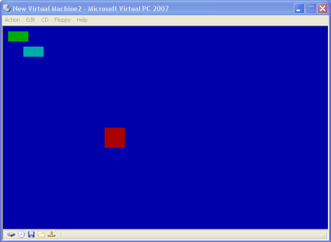 This demo spices what we talked about a little by adding an additional routines: line, which renders a horizontal line, and is used to render the rectangles in the demo. ConclusionThat's all for this chapter! The next chapter will cover VESA VBE and how we can use it to work with high resolution graphics modes. We will also cover the Super VGA, Bank Switching, and a few more graphics concepts including Double and Triple Buffering, and Page Flipping. Thats right, we are going high resolution with VBE :) We will also be going back to C in the next chapter and cover some more graphics primitives. I still plan on covering VGA hardware however that will be after VBE. VGA hardware is quite overcomplicated; I want to hold off on the more complex topics in graphics and VGA until a little later. Until next time,