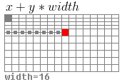 The top-left corner of video memory is at v = [0,0] where v is a 2d vector. This is the first pixel in video display. The last byte is at v = [width, height]. Assuming each coordinate is a pixel, we can come up with a formula that allows us to be able to draw a pixel at any location on screen. Lets say we start at v = [0,0] in the graph above. If we add width to our position, we always end up right below where we were. For example, in the above graph, width = 16. Assuming we started at the top-left corner, counting 16 to the right, you will find yourself right below (on the next line) from where you started. Because of this, we can calculate y by doing y * width. Afterwords we can just add x (The offset in that line) and we have our formula:
