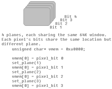 This is known as Bank Switching. A "Bank" is a window into the larger video memory. The size of the window is typically 64K do to standard VGA only having a graphics region of 64K. Planer MemoryOkay, it gets a little tricky here. Standard VGA modes operate in planer memory mode. This is the VGAs native memory model.